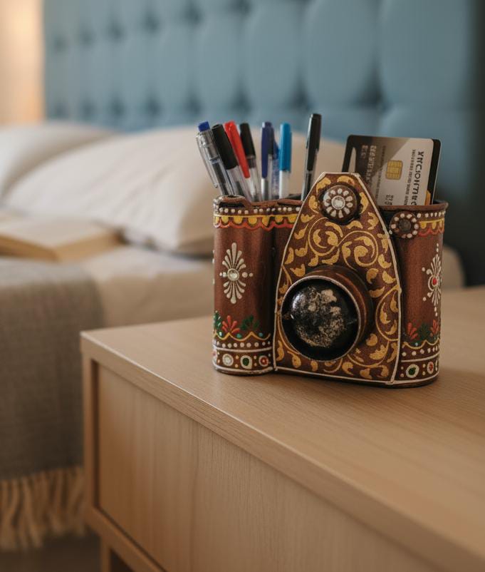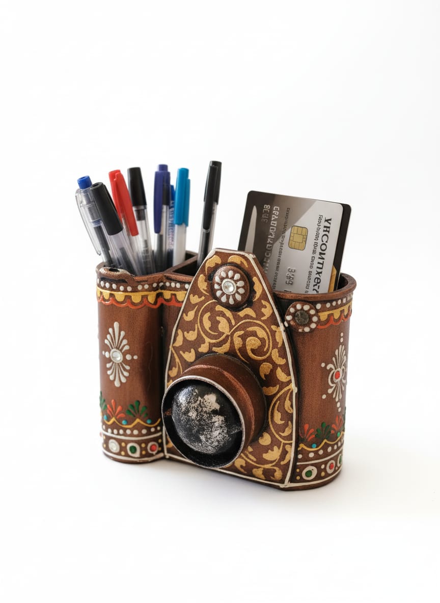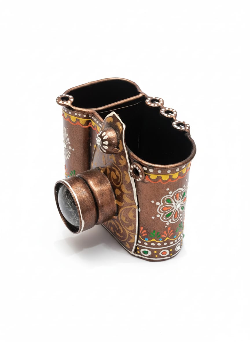 Description:- Design: It is shaped like a camera, featuring a lens-like projection at the front and separate compartments on the top/side where you can store pens, pencils, or other small items.