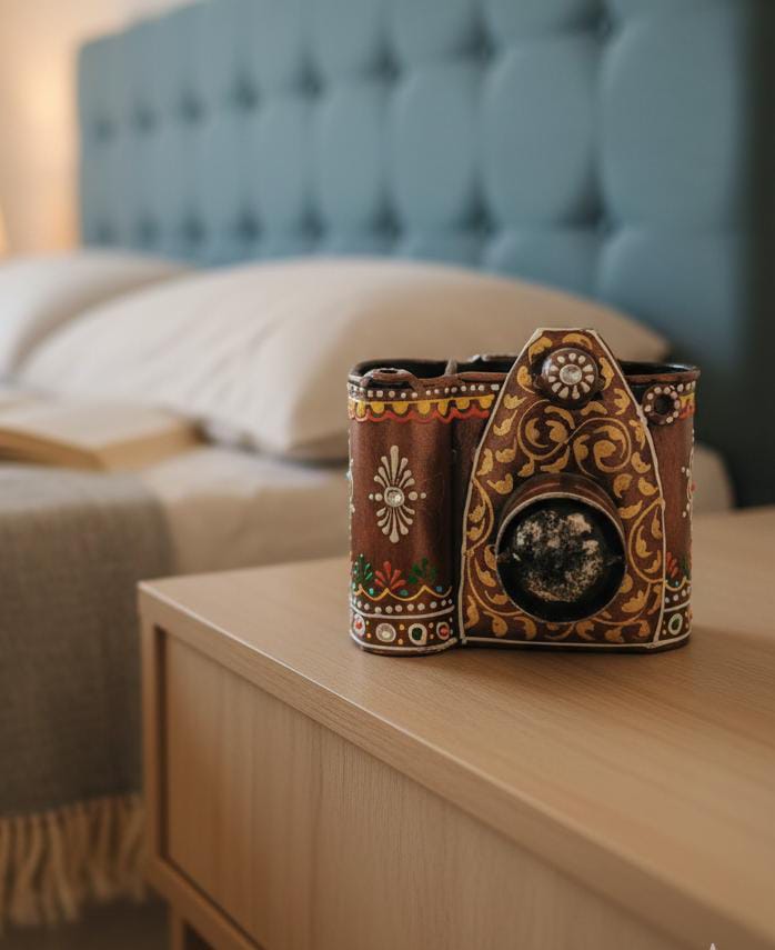 Appearance: Shaped like a vintage camera with a distinct lens area and segmented storage compartments.