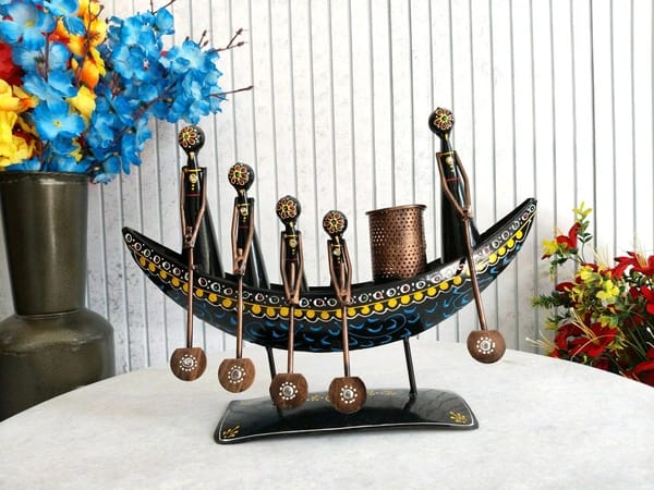 This is a decorative piece, generally known as a Metal Tribal Boat Showpiece or an Ethnic Boat Pen Stand. It is a common style of handicraft, often originating from regions in India (like Rajasthan or Chhattisgarh, featuring styles like Wrought Iron or Dhokra/Brass Art).Design & Composition: The sculpture depicts a stylized long, narrow boat (reminiscent of a canoe or naav) on a flat base. The boat is populated with several slender, tribal-style human figures.
