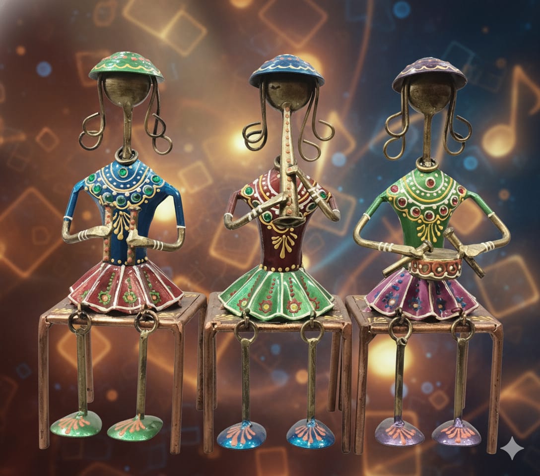 Instruments: Each figure is a musician: one playing a string instrument, one a wind instrument (flute/trumpet), and one a small drum (percussion).