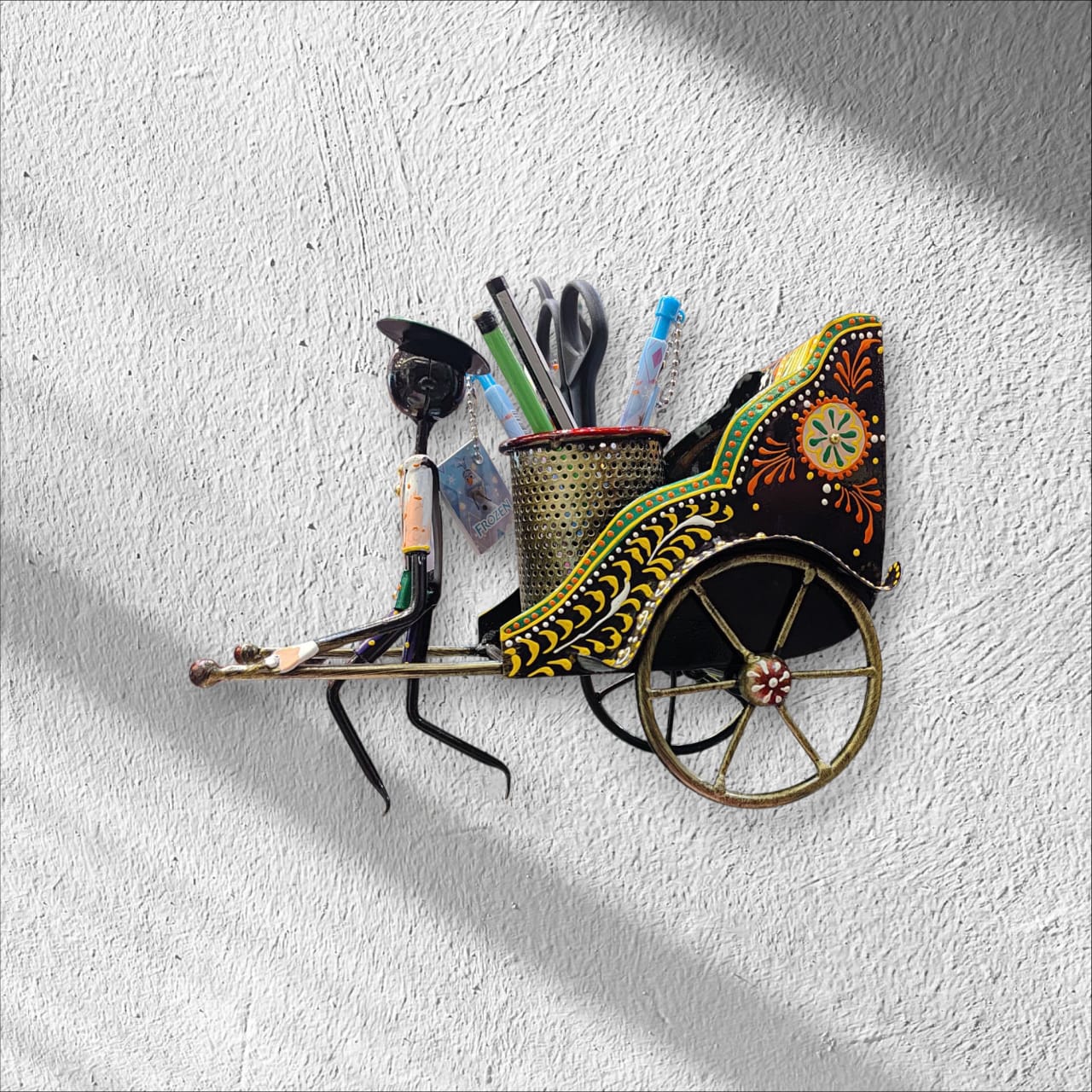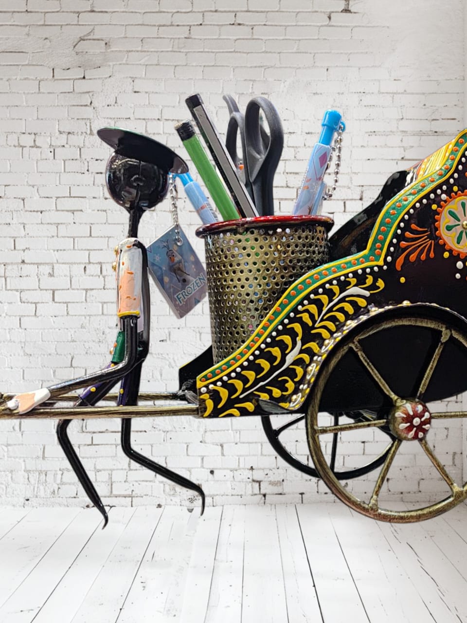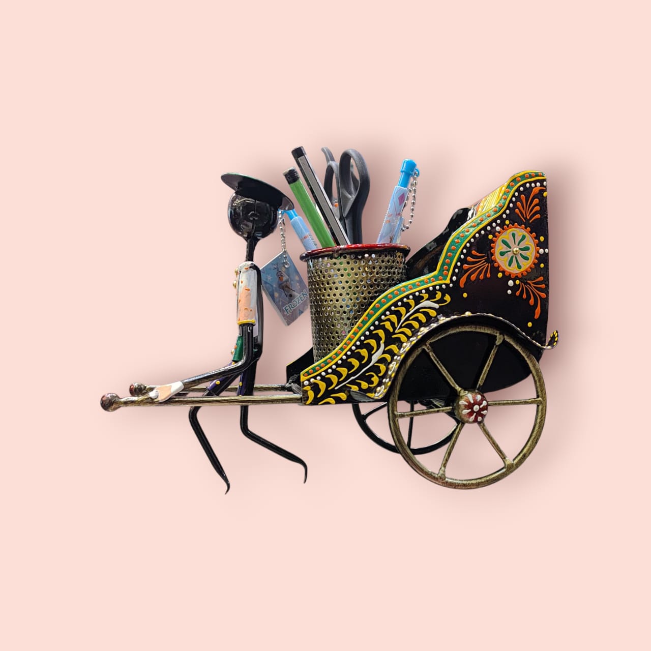 It appears to be a small metal handicraft shaped like a rickshaw or a carriage, likely a pen holder or a small utility container.