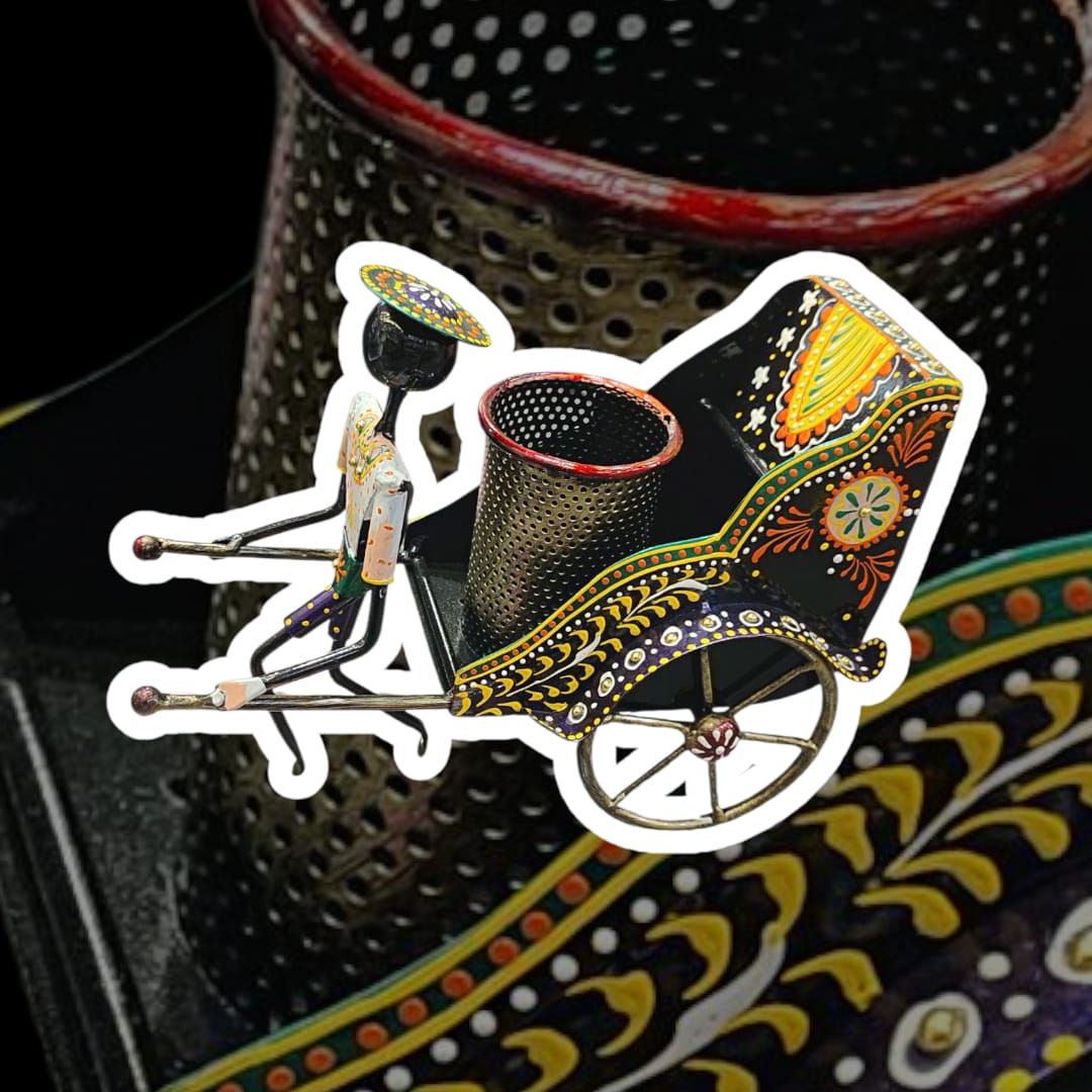 Subject: A rickshaw being pulled by a stylized human figure (the rickshaw puller).