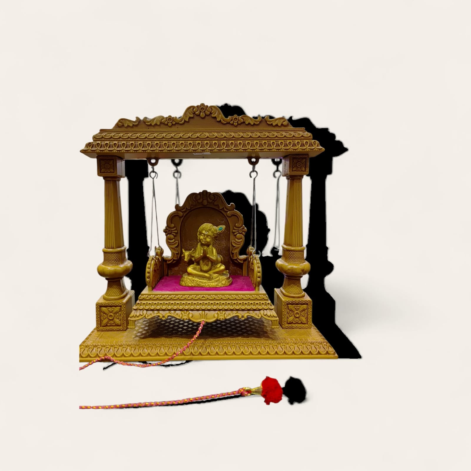 Decoration: A pink beaded necklace with a small, red pom-pom or tassel on the end is resting on the velvet seat, suggesting it is a decorative accessory for the idol.