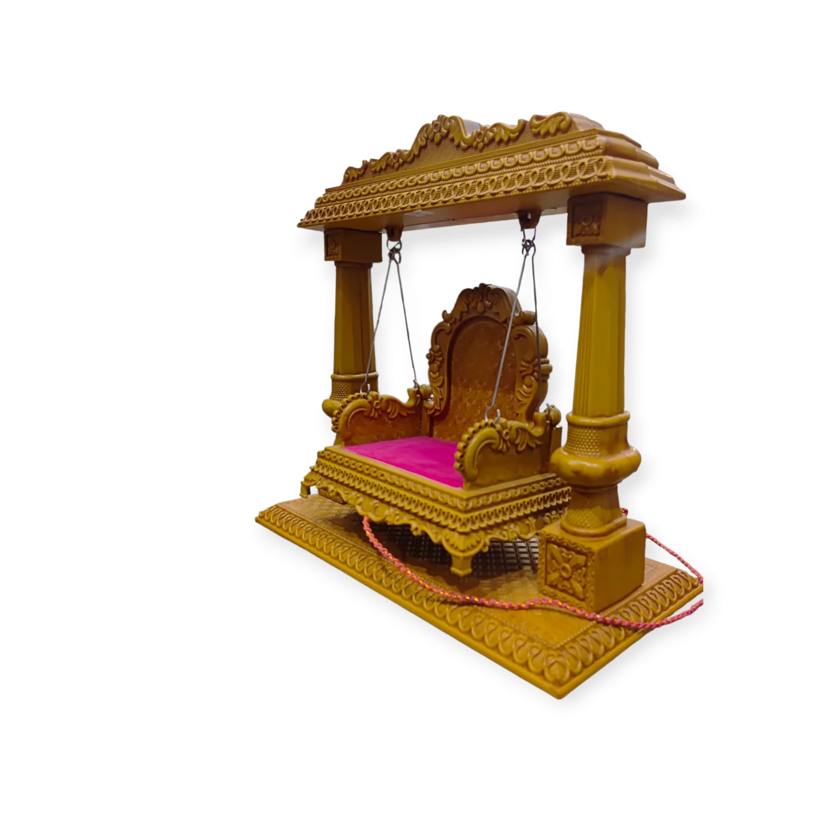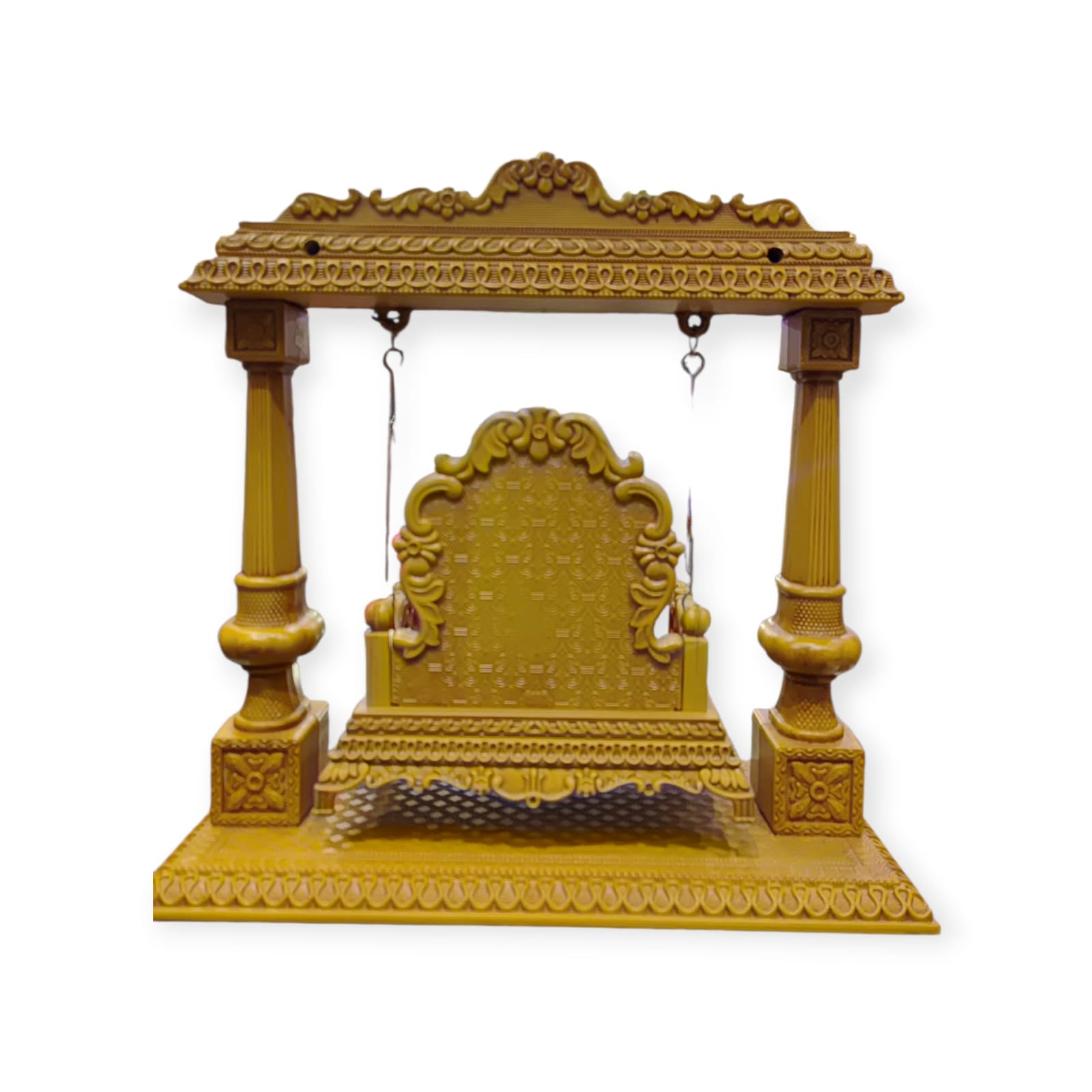 Intricate Carvings: The swing is heavily ornamented with intricate, three-dimensional carvings. The top canopy/arch features repeated floral or scrollwork patterns along its entire length, giving it a regal and detailed look.