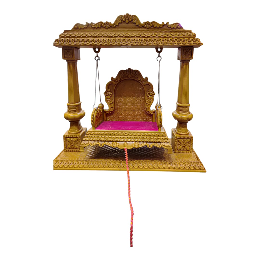 *The image displays a beautifully handcrafted, golden-colored miniature swing, known as a Jhula or Palna (cradle), which is traditionally used for placing and ceremonially swinging a small idol of a deity, most commonly Lord Krishna (Laddu Gopal), particularly during the festival of Janmashtami.